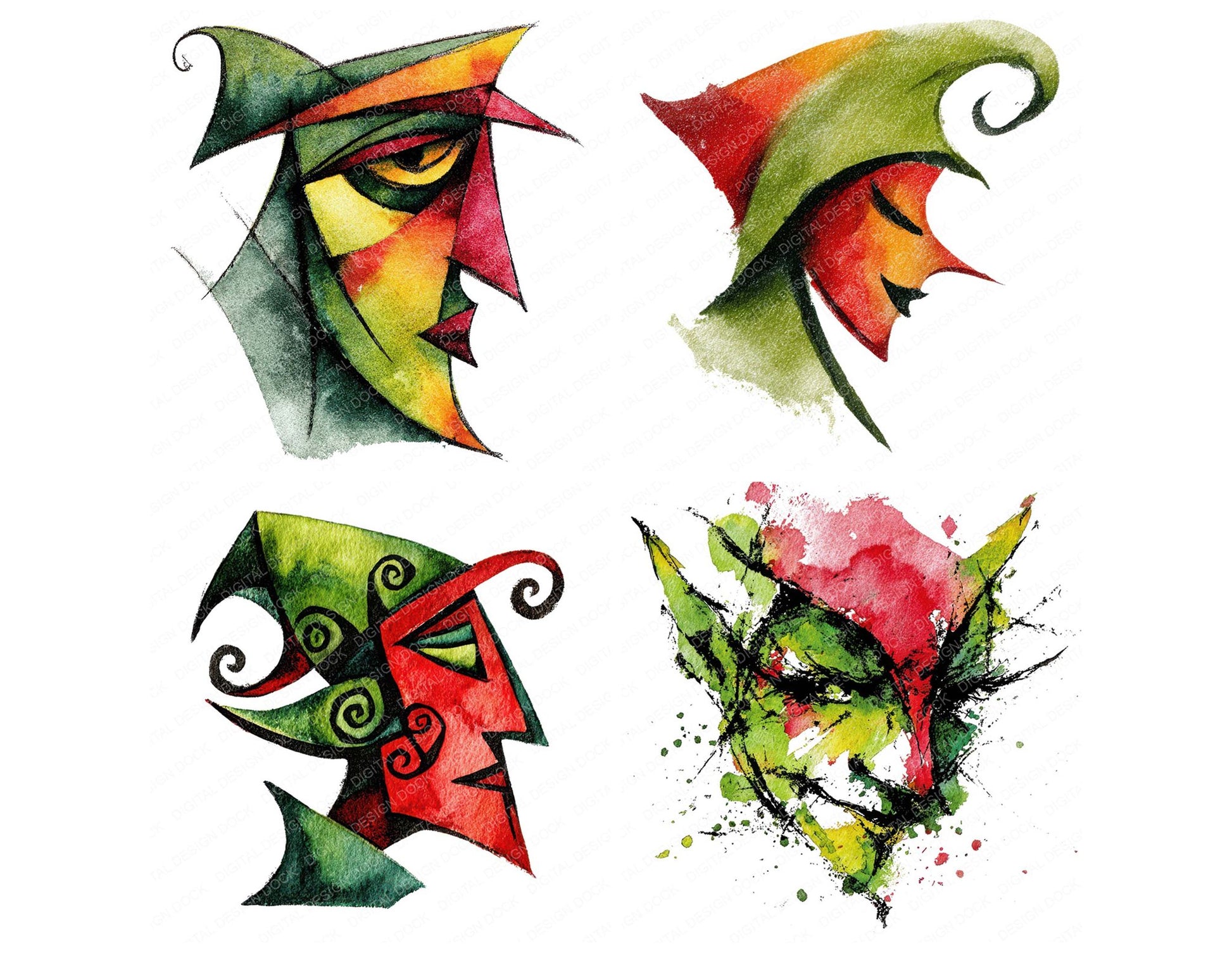 A high quality clipart set featuring Abstract Elf Face elements. Perfect for junk journals, scrapbooking, card making, planners, digital design projects, printables, and creative craft work.