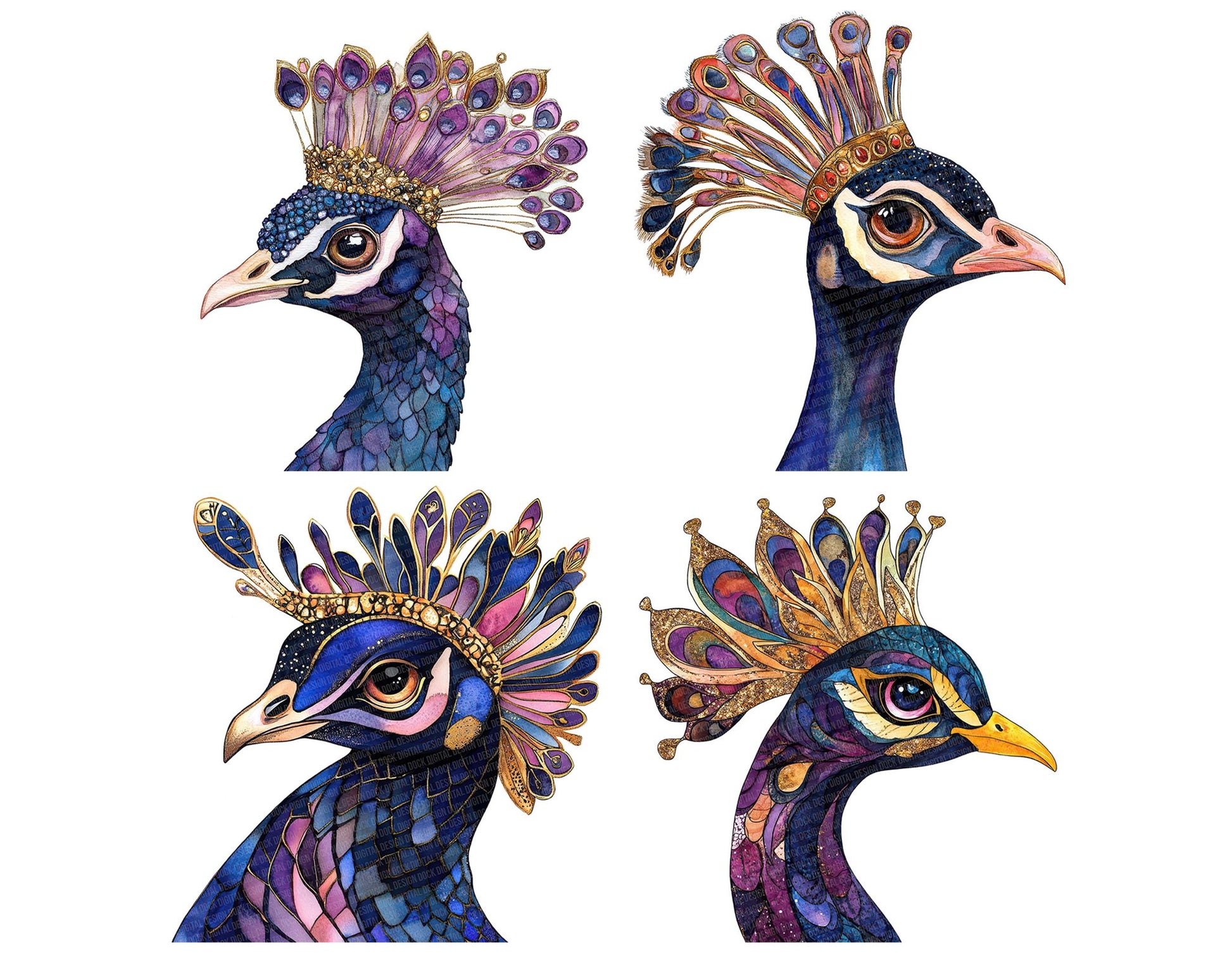 A high quality clipart set featuring Abstract Gold Peacock Head elements. Perfect for junk journals, scrapbooking, card making, planners, digital design projects, printables, and creative craft work.