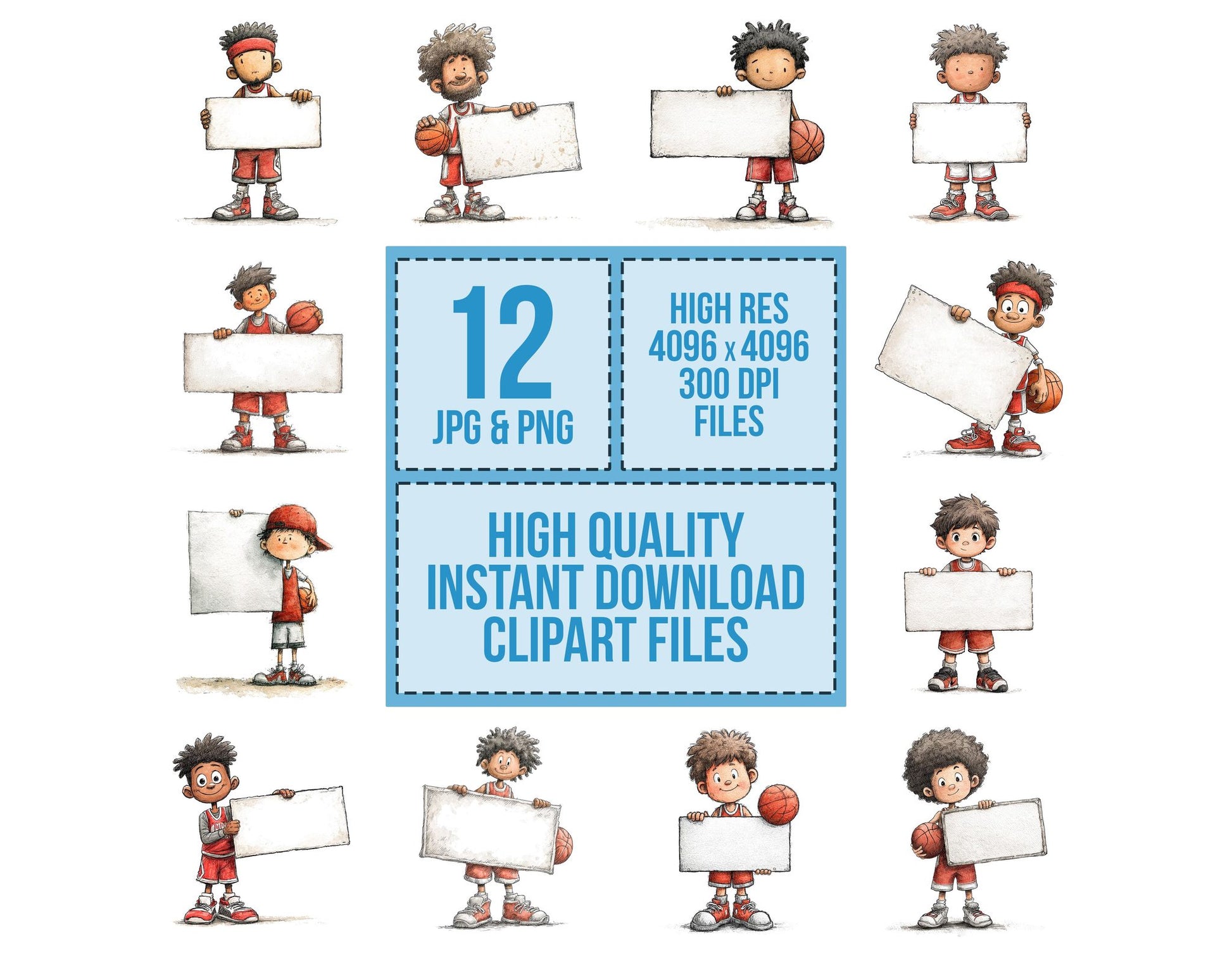 A high quality clipart set featuring Basketball Player Holding Banner elements. Perfect for junk journals, scrapbooking, card making, planners, digital design projects, printables, and creative craft work.