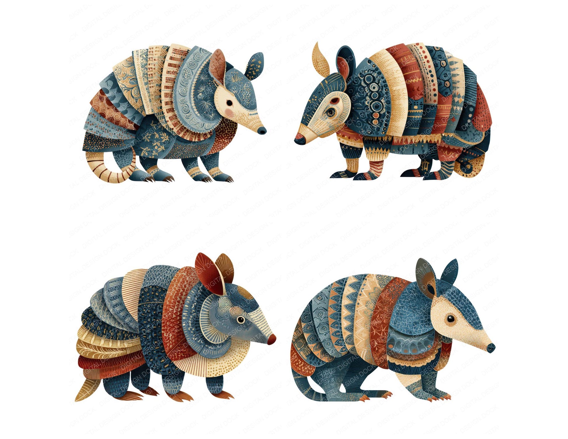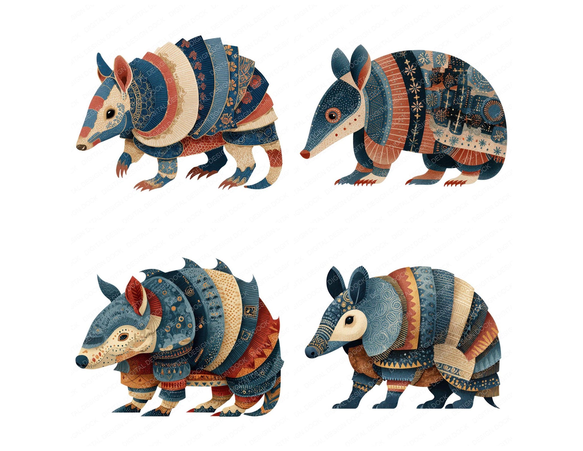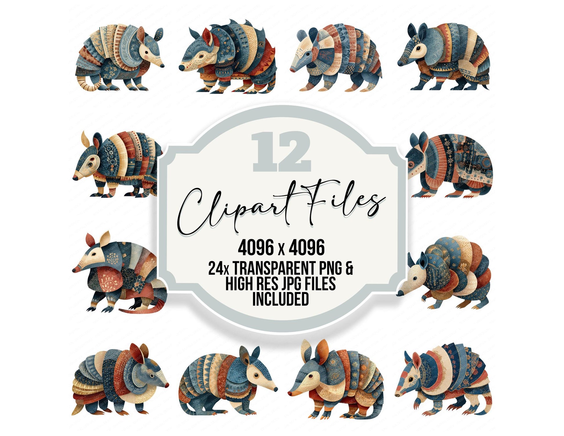 A high quality clipart set featuring Folk Art Armadillo elements. Perfect for junk journals, scrapbooking, card making, planners, digital design projects, printables, and creative craft work.