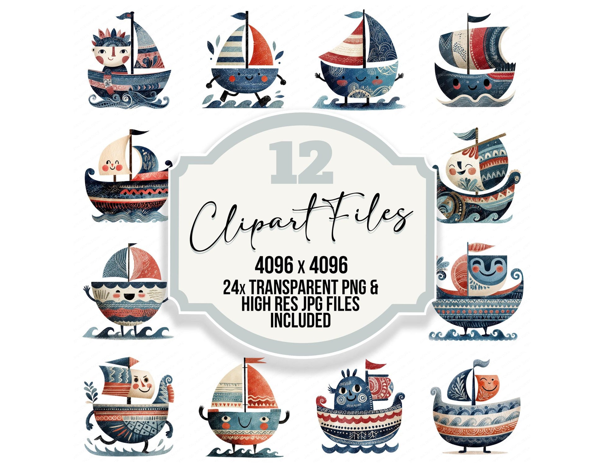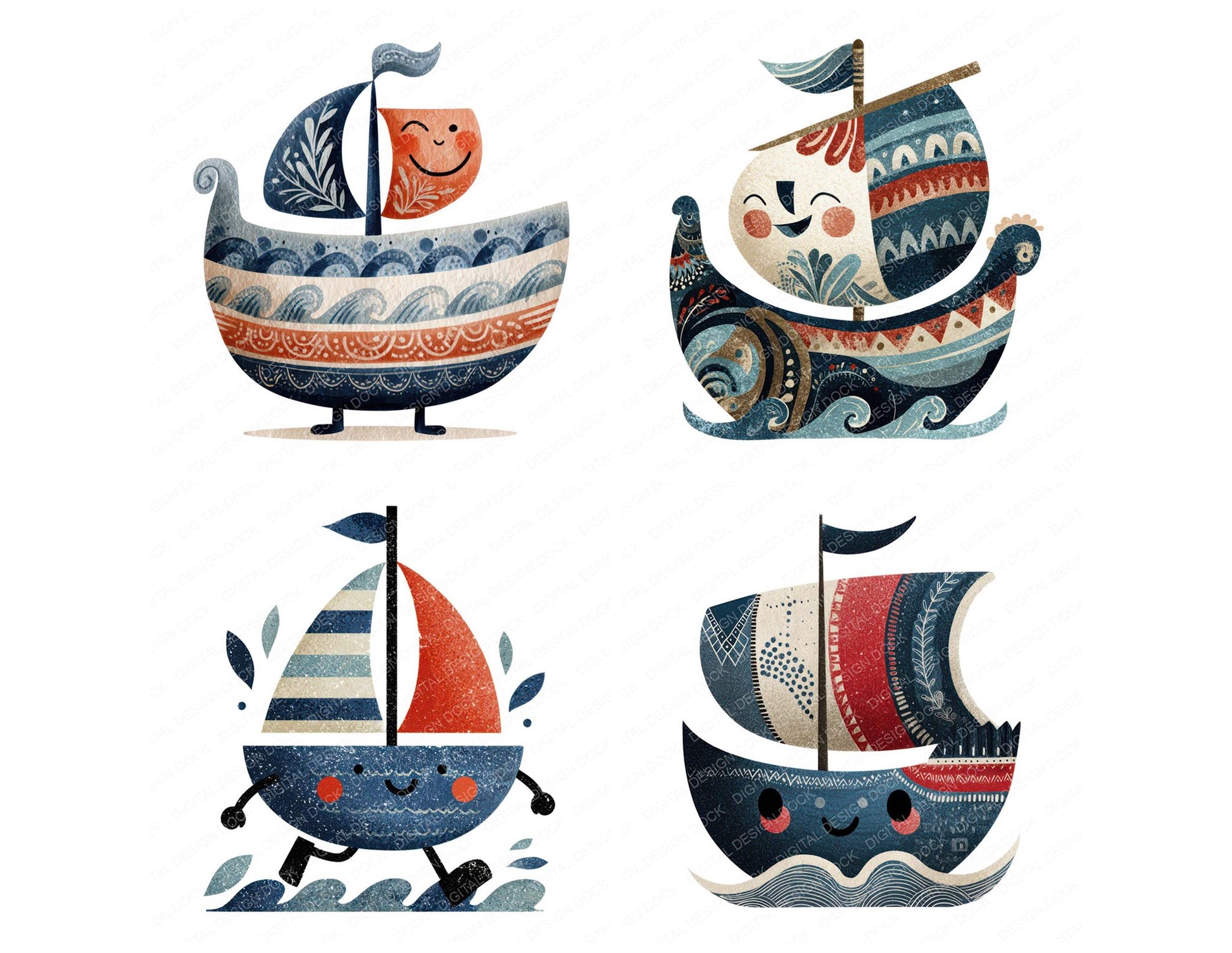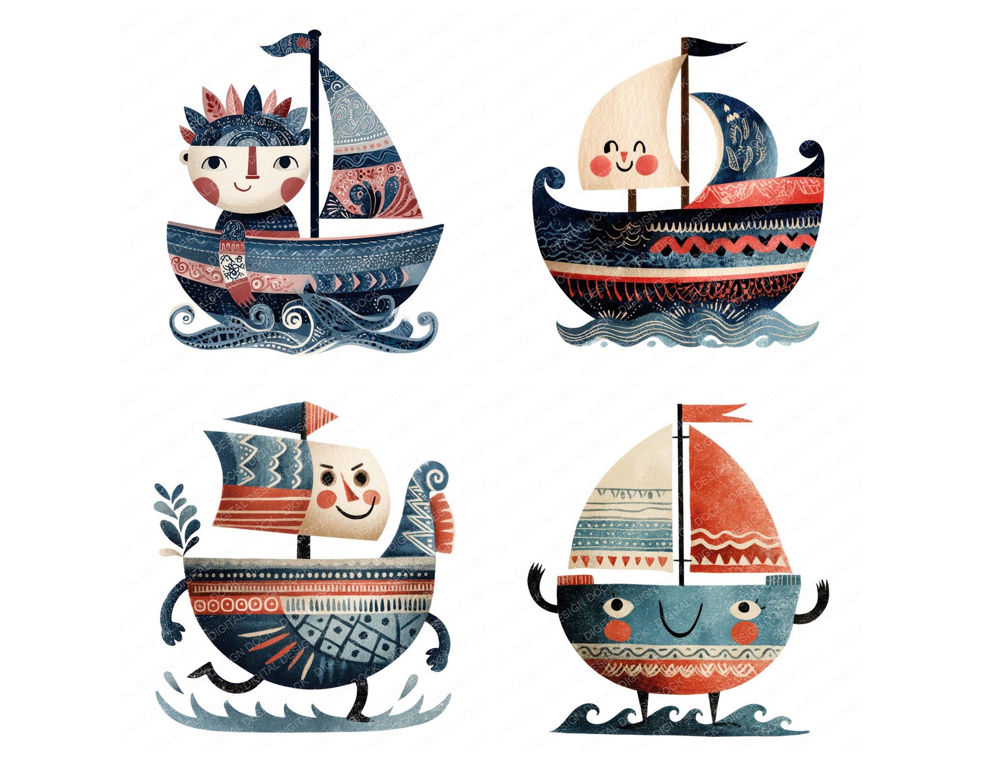 A high quality clipart set featuring Folk Art Boat Character elements. Perfect for junk journals, scrapbooking, card making, planners, digital design projects, printables, and creative craft work.