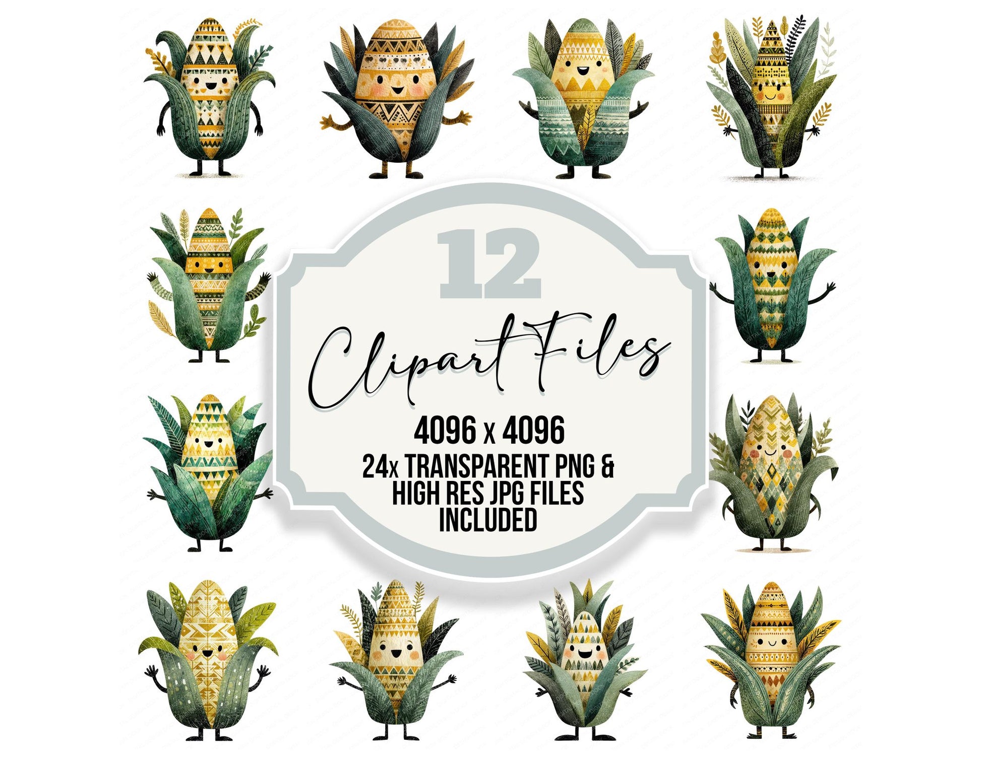 A high quality clipart set featuring Folk Art Corn Character elements. Perfect for junk journals, scrapbooking, card making, planners, digital design projects, printables, and creative craft work.