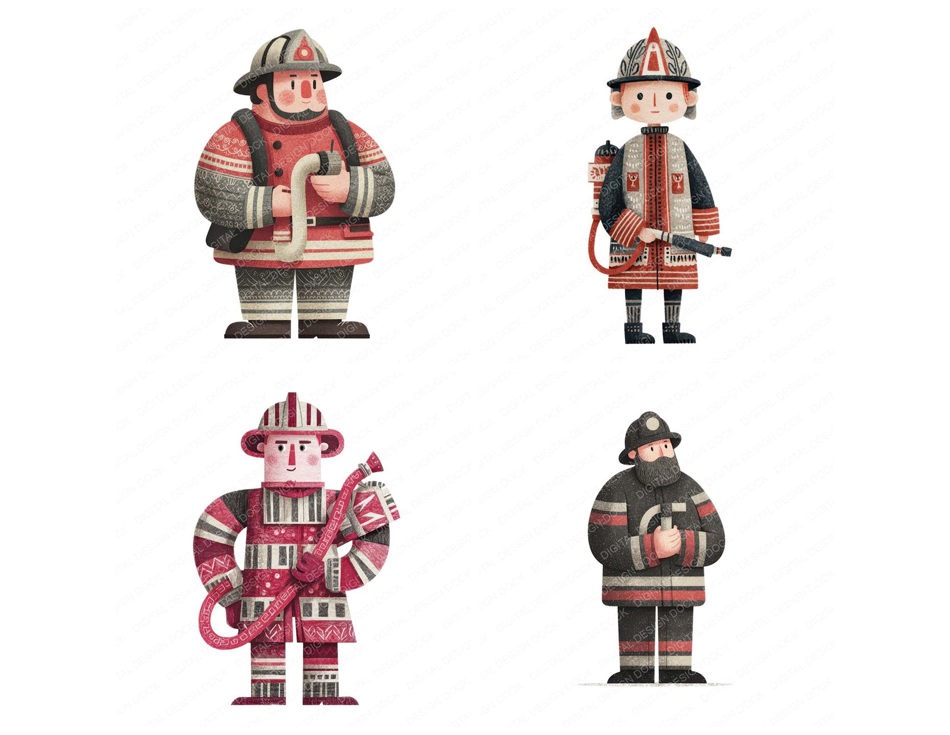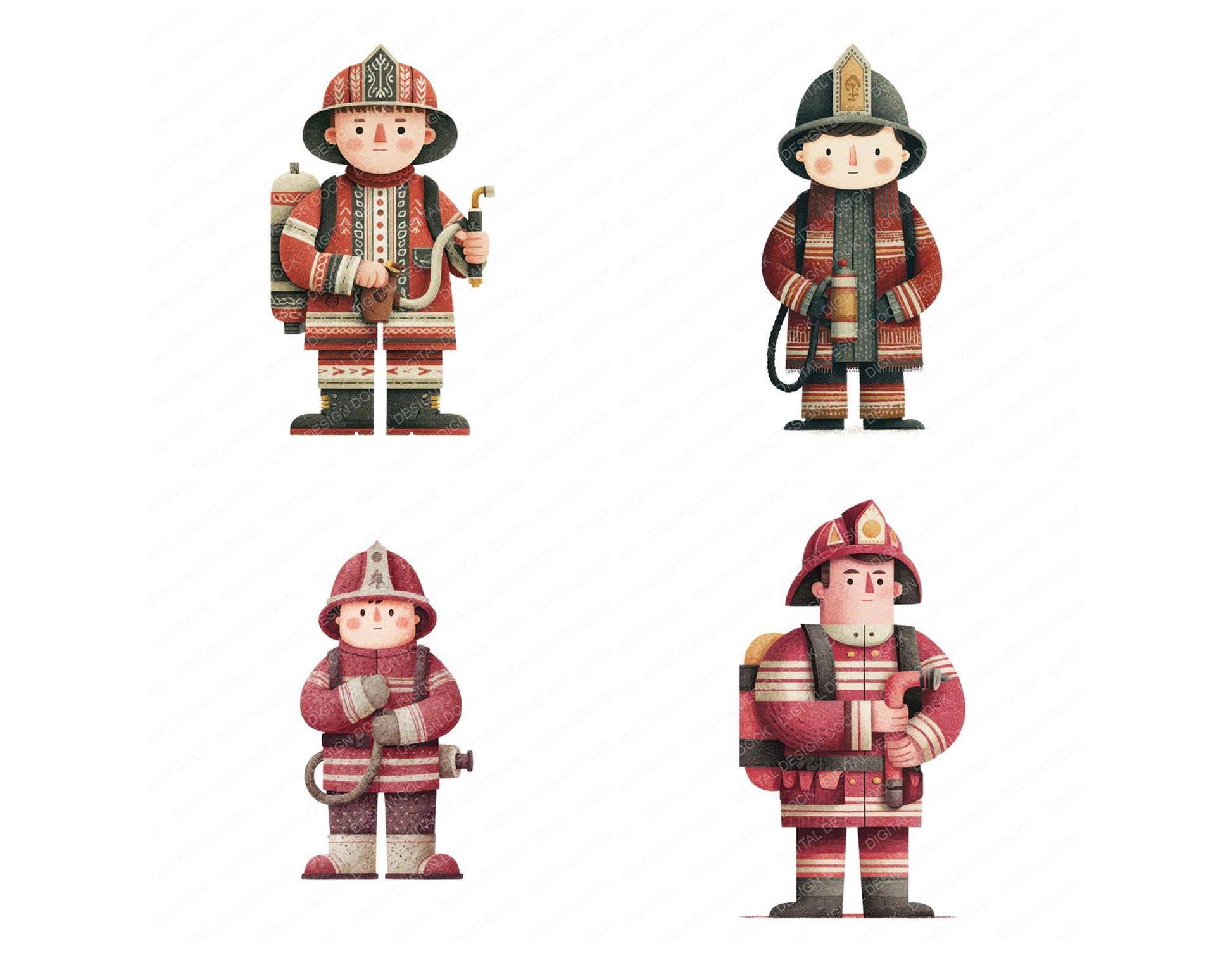 A high quality clipart set featuring Folk Art Firefighter Character elements. Perfect for junk journals, scrapbooking, card making, planners, digital design projects, printables, and creative craft work.