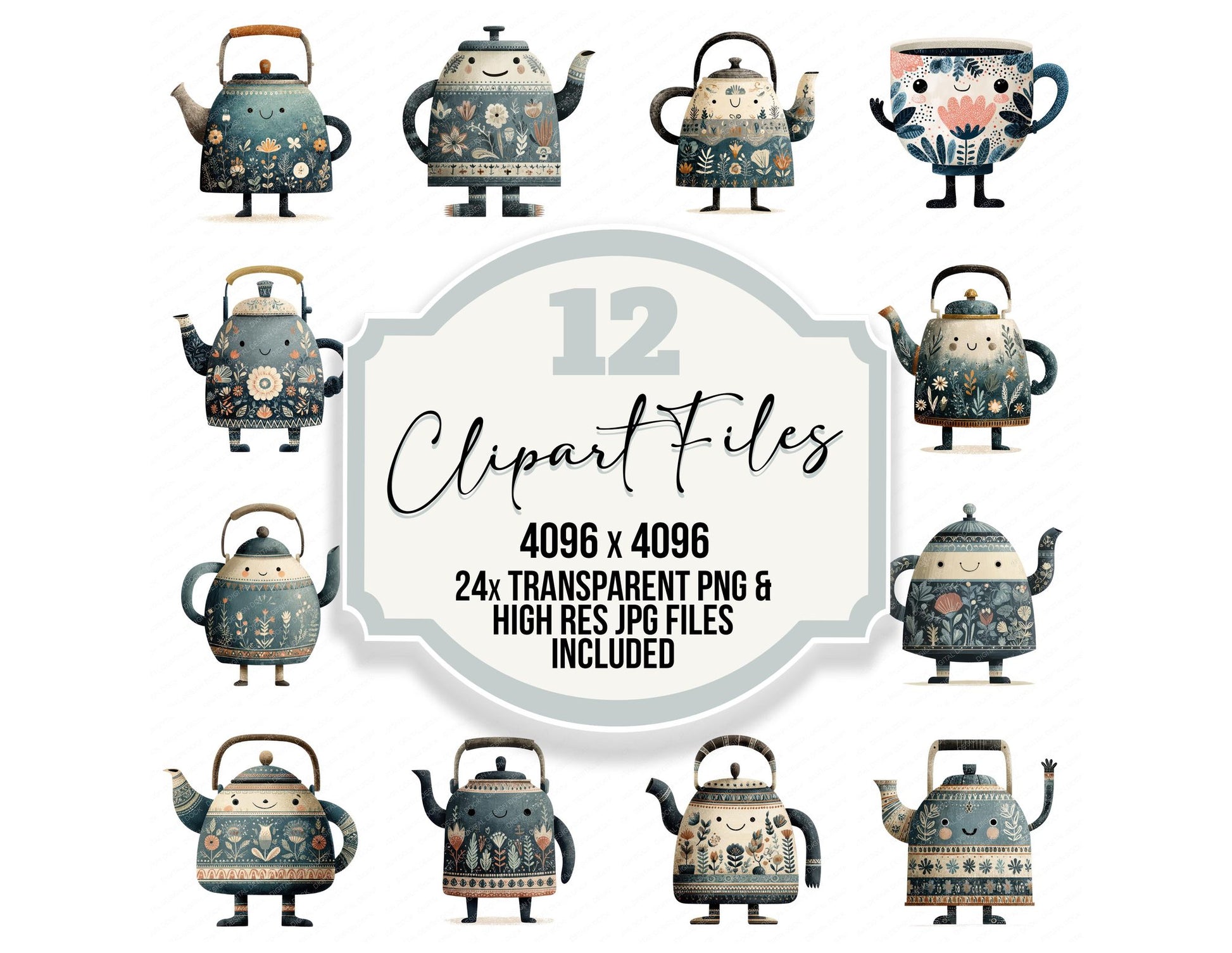 A high quality clipart set featuring Folk Art Kettle Character elements. Perfect for junk journals, scrapbooking, card making, planners, digital design projects, printables, and creative craft work.