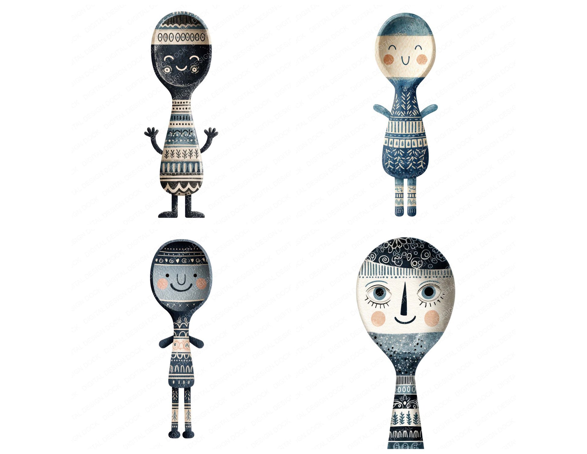 A high quality clipart set featuring Folk Art Spoon Character elements. Perfect for junk journals, scrapbooking, card making, planners, digital design projects, printables, and creative craft work.