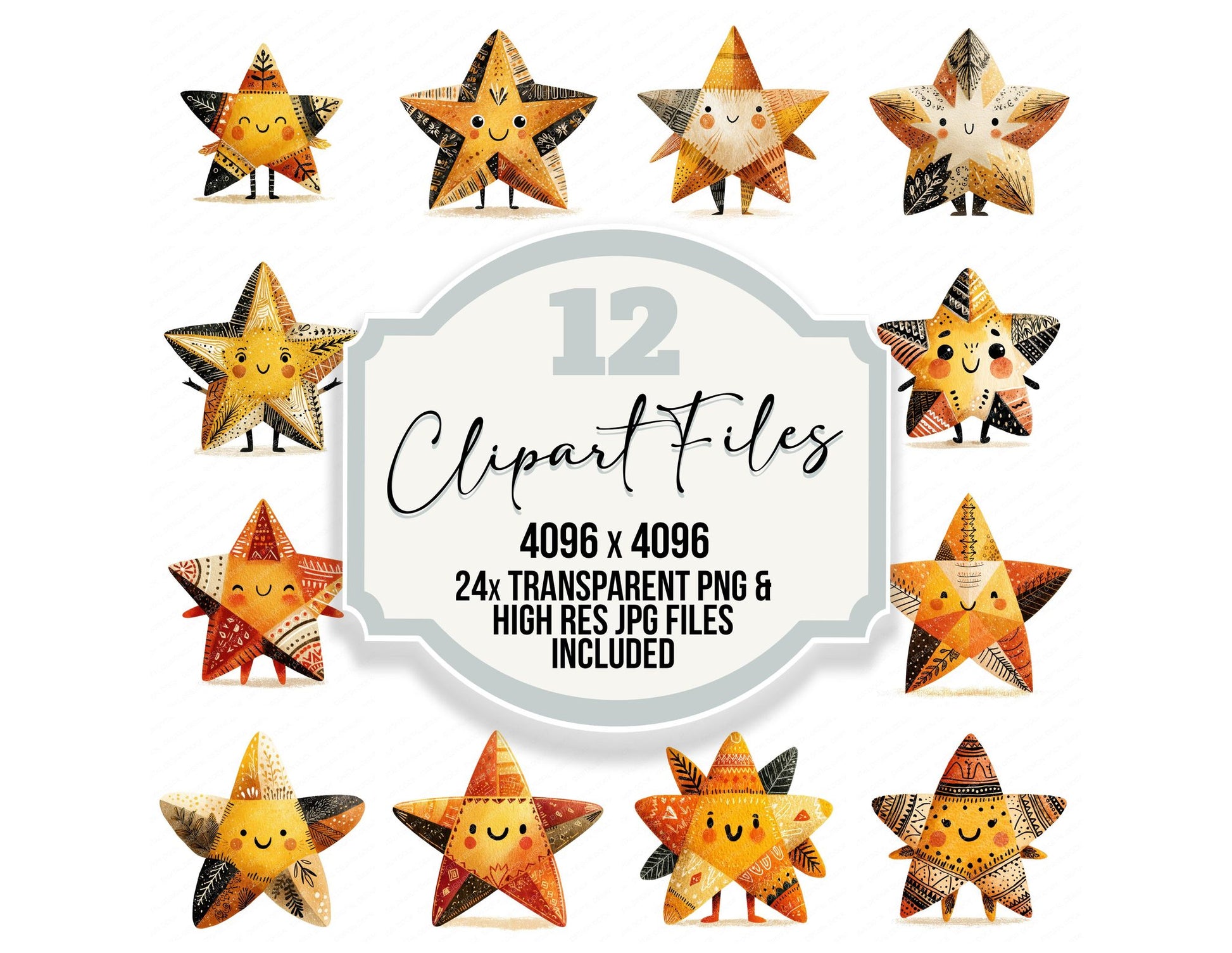 A high quality clipart set featuring Folk Art Star Character elements. Perfect for junk journals, scrapbooking, card making, planners, digital design projects, printables, and creative craft work.
