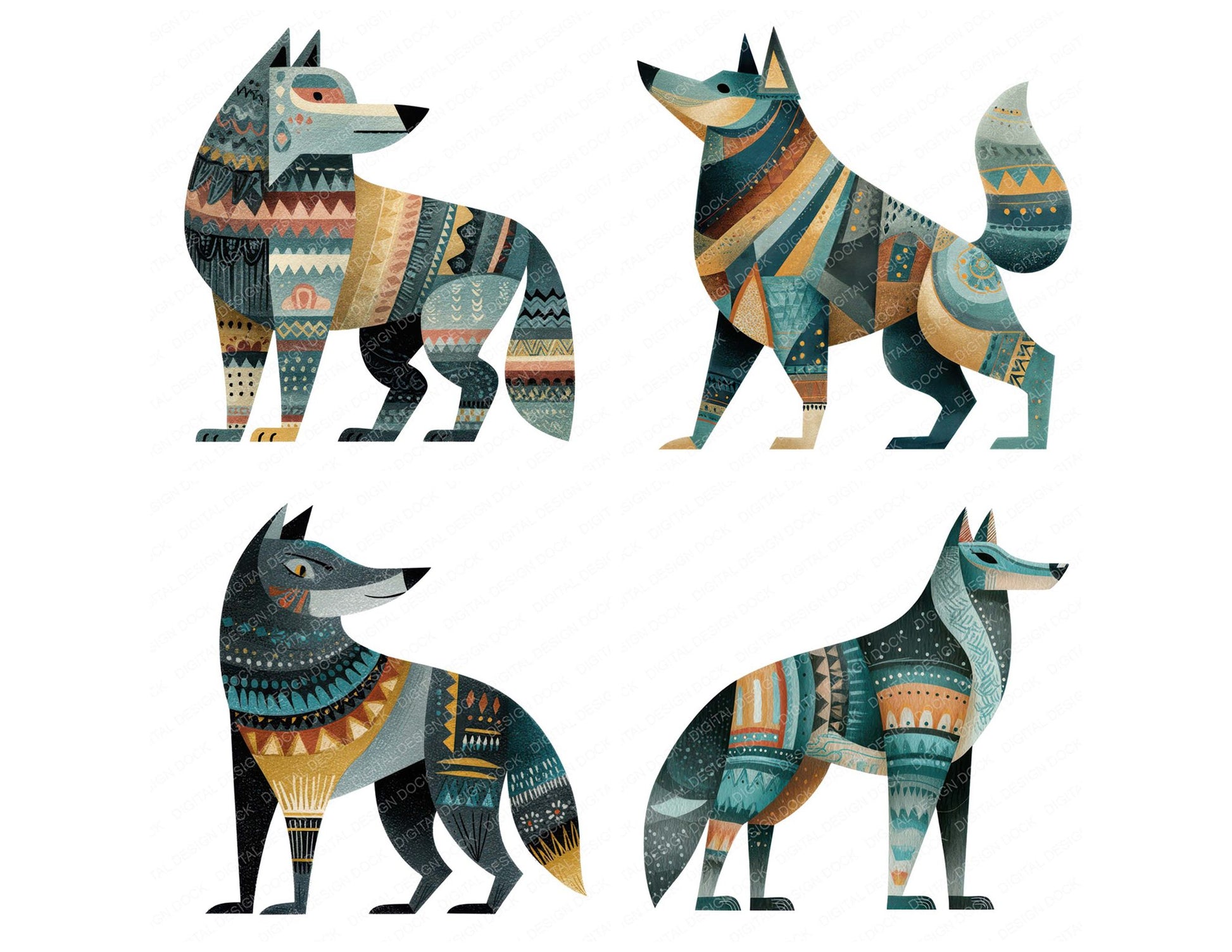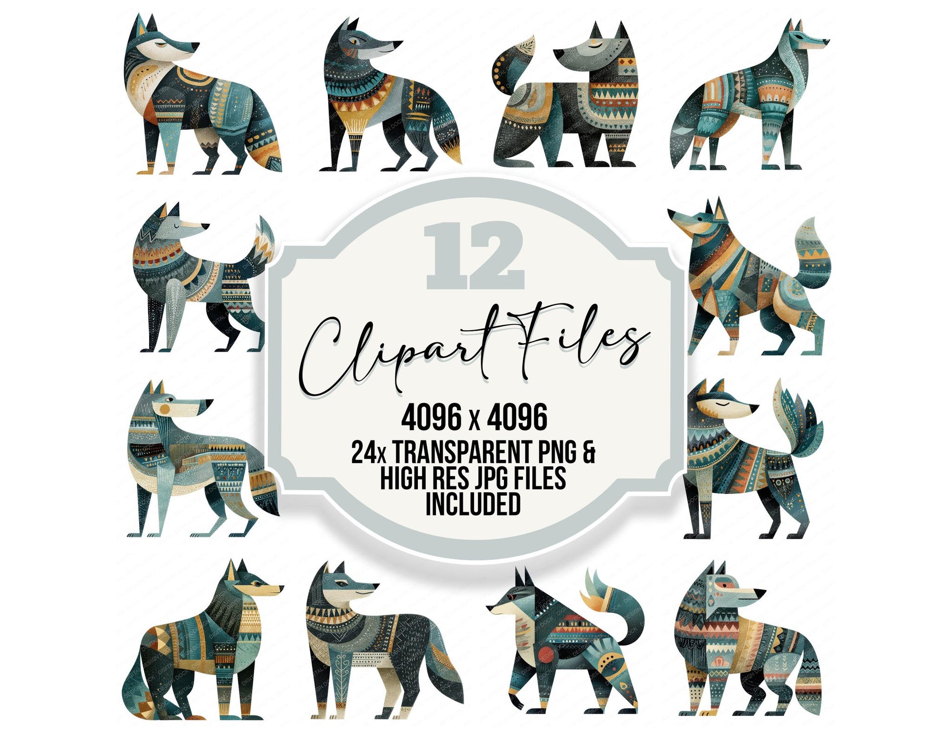 A high quality clipart set featuring Folk Art Wolf elements. Perfect for junk journals, scrapbooking, card making, planners, digital design projects, printables, and creative craft work.