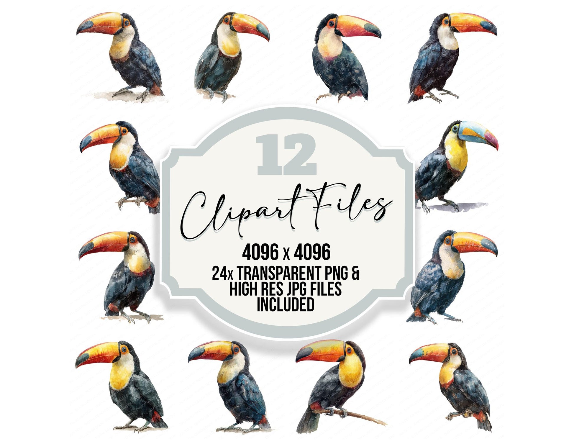 A high quality clipart set featuring Toucan Exotic Bird elements. Perfect for junk journals, scrapbooking, card making, planners, digital design projects, printables, and creative craft work.