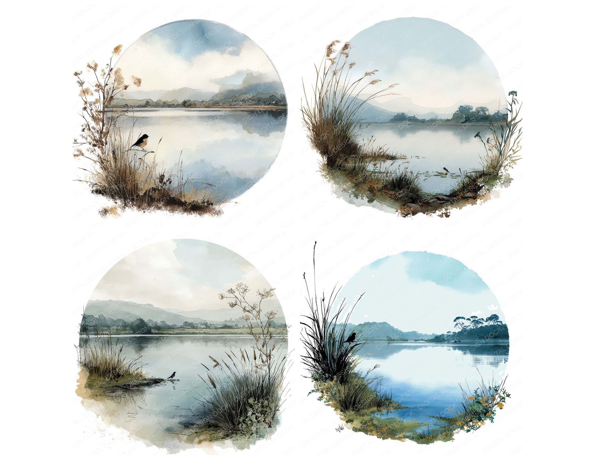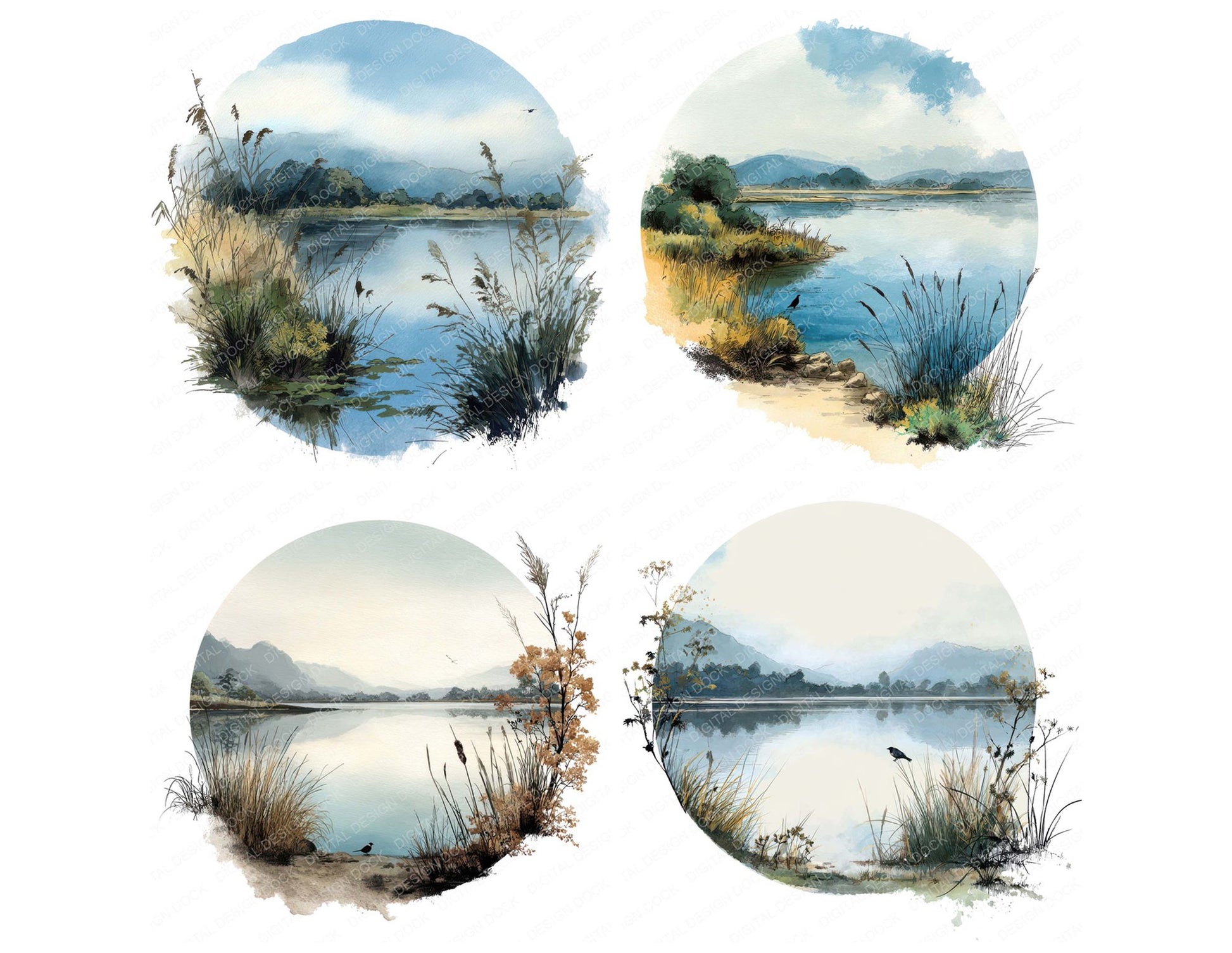 A high quality clipart set featuring Watercolour Lakeside Circle elements. Perfect for junk journals, scrapbooking, card making, planners, digital design projects, printables, and creative craft work.