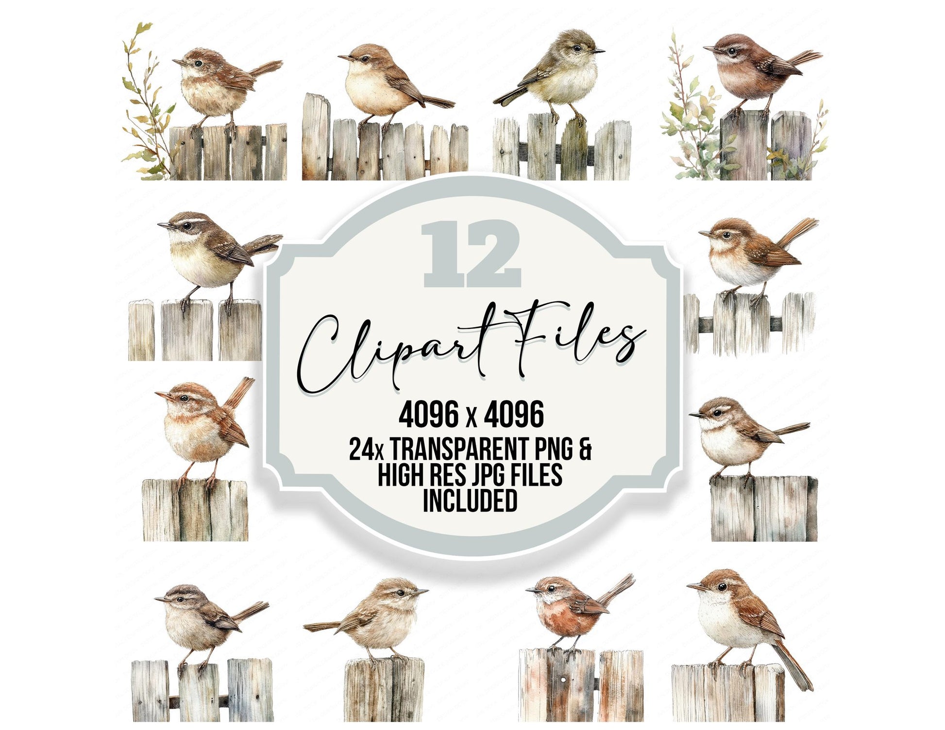 A high quality clipart set featuring Wren on a Fence elements. Perfect for junk journals, scrapbooking, card making, planners, digital design projects, printables, and creative craft work.
