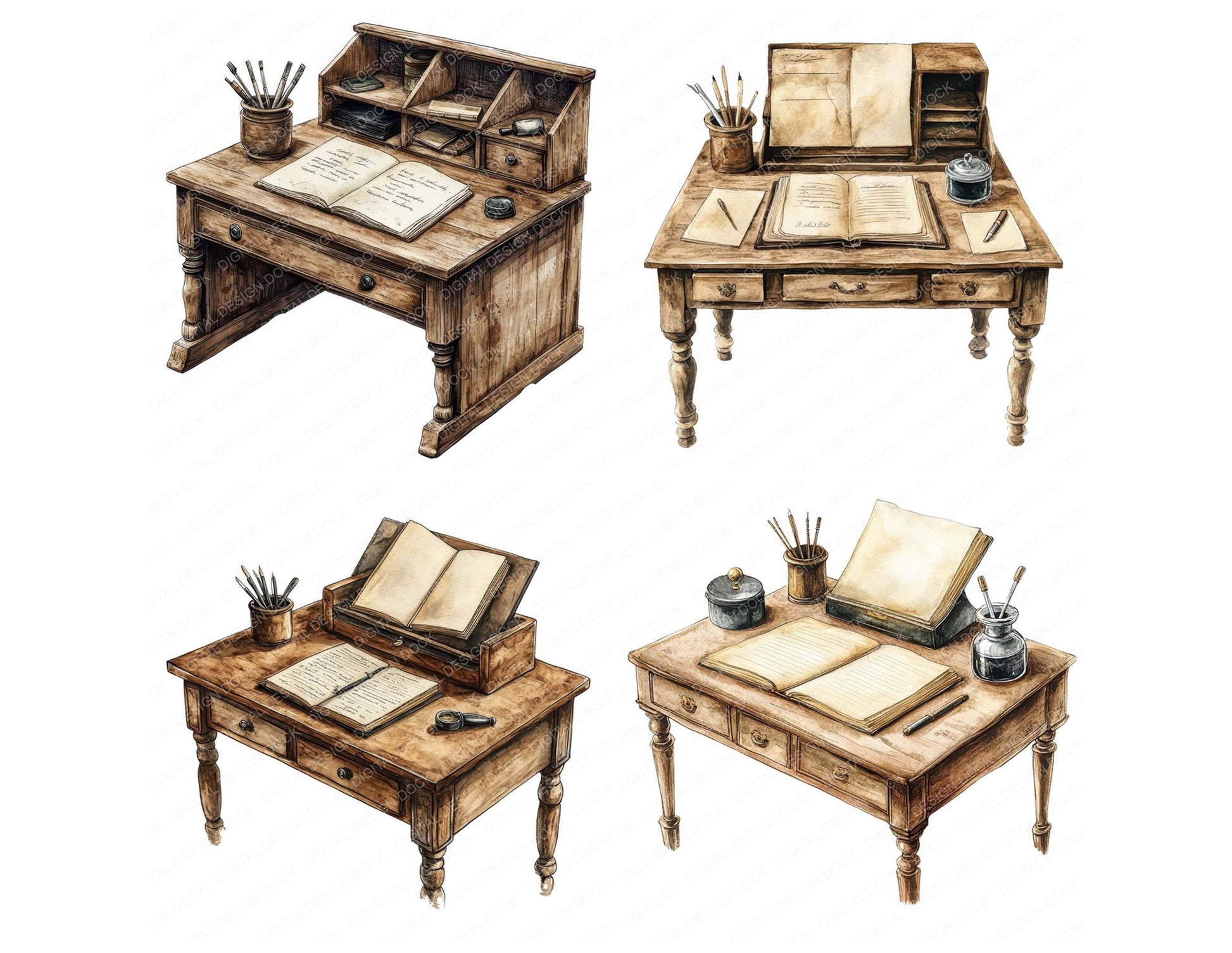 A high quality clipart set featuring Writing Desk with Inkwell elements. Perfect for junk journals, scrapbooking, card making, planners, digital design projects, printables, and creative craft work.
