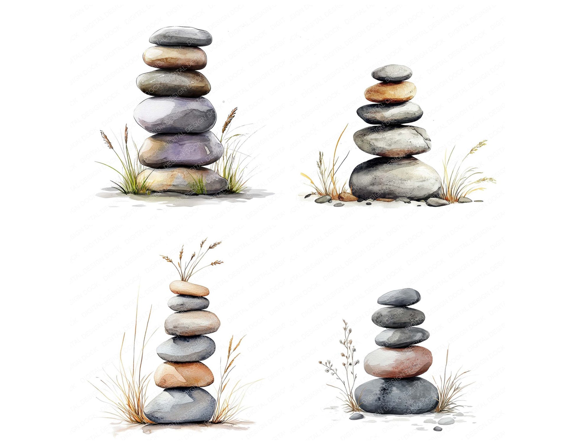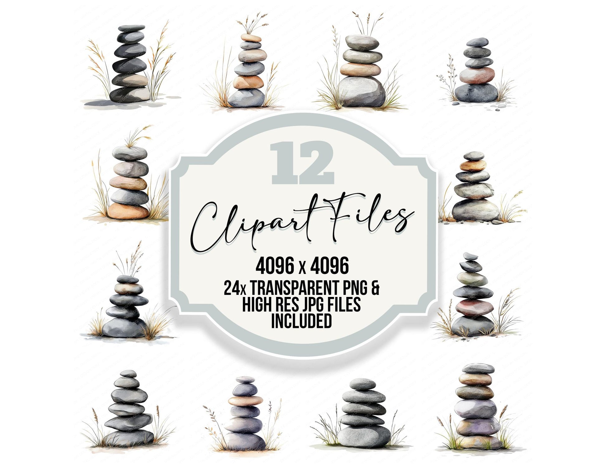 A high quality clipart set featuring Zen Stone Stack elements. Perfect for junk journals, scrapbooking, card making, planners, digital design projects, printables, and creative craft work.